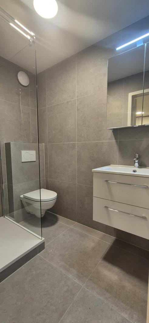 - Badkamer met douche, toilet en lavabomeubel