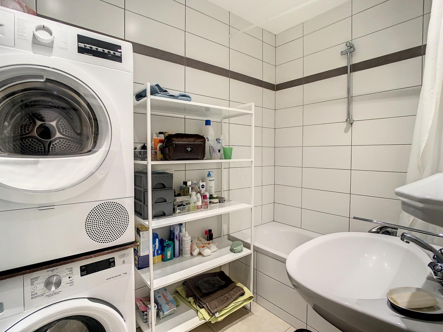 • Stijlvolle badkamer met bad/douche, lavabo en aansluiting voor wasmachine
